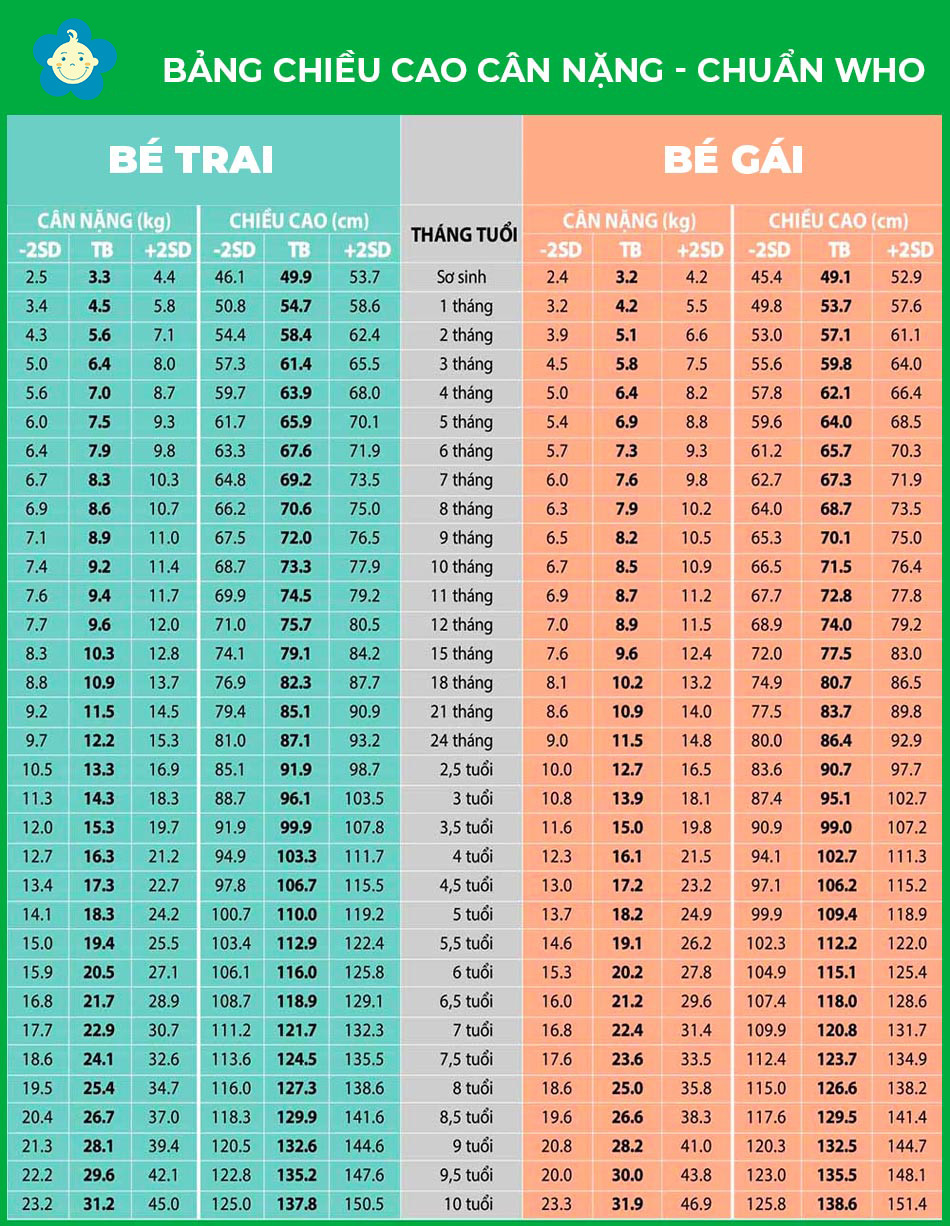 Việc theo dõi chiều cao cân nặng của trẻ là vô cùng quan trọng đối với các bậc phụ huynh. Đây là một trong những chỉ số quan trọng giúp cha mẹ đánh giá sự phát triển của con yêu. Bài viết dưới đây cung cấp bảng chiều cao cân nặng chuẩn của trẻ sơ sinh, bé trai, bé gái từ 0-18 tuổi theo tiêu chuẩn của Tổ chức Y tế Thế giới (WHO), giúp phụ huynh có cái nhìn tổng quan và điều chỉnh chế độ dinh dưỡng, chăm sóc để bé yêu phát triển toàn diện.